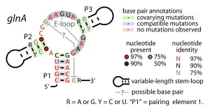 A possible structural resemblance was observed between the glnA RNA motif and the Downstream-peptide motif.[1] The most apparent similarity is between the stems labeled "P1" in each motif, but other similarities were observed.[1] It was proposed that both motifs represent riboswitches involved in nitrogen metabolism. The fact that RNAs from both motifs selectively bind glutamine supports this hypothesis, but detailed structural data is not yet available. The glnA motif has an E-loop[7][8] structure (also called a bulged-G module) within it.