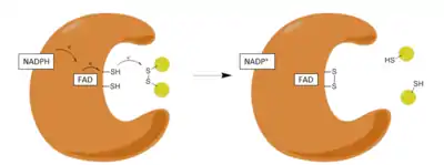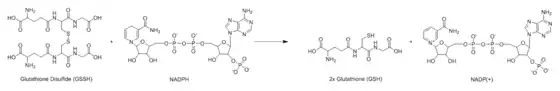Glutathione reductase (GR) also known as glutathione-disulfide reductase (GSR) is an enzyme that in humans is encoded by the GSR gene. Glutathione reductase (EC 1.8.1.7) catalyzes the reduction of glutathione disulfide (GSSG) to the sulfhydryl form glutathione (GSH), which is a critical molecule in resisting oxidative stress and maintaining the reducing environment of the cell.[5][6][7] Glutathione reductase functions as dimeric disulfide oxidoreductase and utilizes an FAD prosthetic group and NADPH to reduce one molar equivalent of GSSG to two molar equivalents of GSH:
