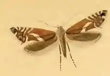 The wingspan is 11–15 mm.[2] The forewings are rather broad, dark golden-bronzy ; five shining white strigulae on posterior half of costa, three anterior terminating in leaden metallic marks ; a thick oblique curved pointed white streak from middle of dorsum, reaching more than half across wing;a leaden-metallic tornal mark, white on margin ; three leaden metallic dots on termen ; an undefined dark apical spot ; dark line of cilia indented below apex ; a dark hook above apex. Hindwings are suboblong, grey ; cilia in male whitish.The larva is pale ochreous ; head dark brown : plate of 2 brownish-ochreous.[3]