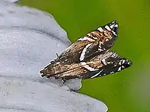 Glyphipterix simpliciella has a wingspan of 6–9 mm.[4] and can reach a length of 3–4 mm. These tiny cryptic moths have dark brown forewings with a slightly metallic sheen. They also show a black apical spot and five white or silvery streaks along their costa, two across the dorsum and one in the posterior corner of the wings. The hindwings are dark grey, with grey cilia. Both sexes are similar.[5]