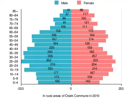 According to the 2011 Poland census, there were 7,904 people residing in Osiek Commune, of whom 50.9% were male and 49.1% were female (out of which the population in rural areas amounts to 5,903, of whom 51.2% were male and 48.8% were female). In the commune, the population was spread out, with 21.2% under the age of 18, 39.3% from 18 to 44, 21.5% from 45 to 64, and 18% who were 65 years of age or older (out of which the population in rural areas amounts to 21.1% under the age of 18, 39.5% from 18 to 44, 20.9% from 45 to 64, and 18.5% who were 65 years of age or older).[1]