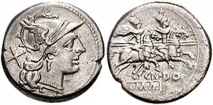 | Helmeted head of Roma right; X (mark of value) behind. | Dioscuri on horseback riding right. Below CN • DO; ROMA in exergue in tablet |