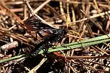 Adults take nectar from flowers, and also likely drink from sap flows.[1] This seems common among Ichneumons. The wasps like to fly low over the ground, where they are identifiable by the long abdomen and orange antennae.[1] The purpose of this behavior is to facilitate prey capture. They capture caterpillars, mainly those of sphinx moths.[1] The wasps do not fly the prey back to a burrow with prey, but lay eggs on the prey itself. The eggs are laid inside the living bodies of the prey.