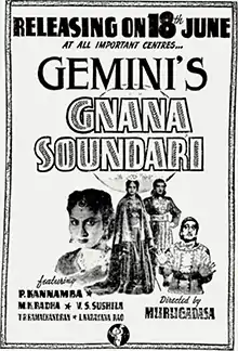 Gnana Soundari is a 1948 Indian Tamil-language film produced by Gemini Studios.[1] A film by the same name and with a same story (Gnana Soundari) but with a different cast and crew was produced by Citadel Studios and was running successfully when this film was released. This film was a flop[2] and the producer withdrew it from circuits.