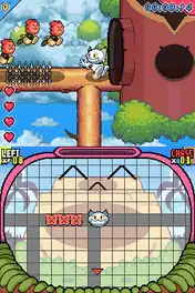 The goal of each stage is to clear the map of all the peaceful enemy characters, many of which will not attack until provoked. The player takes control of Kokopolo (or Tatsumo) who can stroll around the stages with the D-Pad, or dash quickly around the stage with one of the shoulder buttons. Knowing when to walk, and when to dash, is actually a key component of this game. The player can also jump with the A button, or scratch with the B button. All of these actions take place on the top screen.