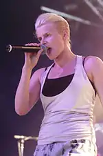 Promotion began in 2009 with the release of the buzz single "Bang", which received positive reviews from music critics.[10] "Bang" was also used for the soundtrack to the 2009 film Fast & Furious and later appeared briefly in the 2010 film Step Up 3D. Rye Rye's track "Get Like This", featuring rapper Busy Signal, appeared on the soundtrack to the 2009 video game NBA Live 10. Following her pregnancy in 2009, she took a short hiatus from promoting the album. By summer 2010, Rye Rye began touring with M.I.A. across Europe, appearing at many of the large music festivals. Late 2010 saw the release of "Sunshine", the first official single off Go! Pop! Bang!. Early 2011 saw Rye Rye collaborating with Urban Outfitters and POP Beauty to create a Go! Pop! Bang!-inspired nail polish set.[11] In addition, Rye Rye embarked on a spring promotional tour, performing in Las Vegas with Robyn on April 14, 2011.[12] This preceded the June 2011 release of "Never Will Be Mine", Rye Rye's second single which features the Swedish singer Robyn. In Summer 2011 promotion of Rye Rye's music saw the use of "New Thing" a new track by Rye Rye used in a Prabal Gurung's fashion video and in an Adidas commercial. Rye Rye has also been affiliated with mobile phone maker HTC. In Spring 2012, Rye Rye released her third single from Go! Pop! Bang!, "Boom Boom", accompanied with a music video. The track listing for Go! Pop! Bang! was revealed via Barnes & Noble's website on April 19.[13]