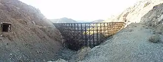 Prior to Spanish governance, there was Native American activity in the area around Goat Canyon;[11] the impact of this activity includes petroglyphs and pictograms in Carrizo Gorge.[12] The last Native Americans to live in the area were the Kumeyaay.[13] Later cattle ranchers utilized the area.[14] Beginning in 1912, construction began on the San Diego and Arizona Eastern Railway in the area.[13] The Carrizo Gorge portion of the line, including Goat Canyon, was the final portion to be completed.[15] A railroad tunnel of The San Diego and Arizona Railway, Tunnel number 15, was built into the side of the canyon but it collapsed in 1932.[16] The collapse was caused by an earthquake, which dramatically changed the inclination of Tunnel number 15.[17] After Tunnel number 15 collapsed, it was decided that it would be bypassed using a wooden trestle.[18] During the construction of the trestle, segments were lowered into the canyon from the partially completed trestle.[19] Construction workers took breaks in a portion of the collapsed tunnel that they called the "mud shed".[20] The trestle was completed in 1933.[21]