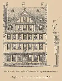 The house was first built around 1618 by Flemish goldsmith Matthis van Hinsberg.[2] It went through a series of owners before being purchased in 1733 by Cornelia Goethe, the grandmother of Johann Wolfgang, who had previously owned an inn on the nearby Zeil. Cornelia purchased two adjoining properties and inhabited both of them; they were connected by destroying the partition wall.[3][4] Johann Caspar Goethe, Cornelia's son and Johann Wolfgang's father, moved into the property in 1741, and lived there with his wife Catharina Elisabeth Goethe from 1748.[5][4]