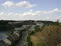 The northern part of Goffle Hill, except in a few locations, is buried under a mantle of glacially derived sediments and sandstone, greatly reducing its topographic prominence.[12] The southern part of the ridge displays a significant amount of trap rock, though some underlying red sandstone reaches up to the ridgeline halfway along the border of North Haledon and Hawthorne where quarrying has stripped away overlying trap rock. The majority of exposed trap rock occurs along high mural precipices facing to the east.