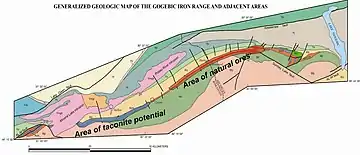 The Gogebic Range is an elongated area of iron ore deposits located within a range of hills in northern Michigan and Wisconsin just south of Lake Superior. It extends from Lake Namakagon in Wisconsin eastward to Lake Gogebic in Michigan, or almost 80 miles. Though long, it is only about a half mile wide and forms a crescent concave to the southeast. The Gogebic Range includes the communities of Ironwood in Michigan, plus Mellen and Hurley in Wisconsin.[1]
