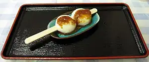 Goheimochi (Japanese: 五平餅) is a type of mochi made in the Chubu region of central Japan, specifically in Nagano, Gifu, and Aichi prefectures.[1] Unlike regular mochi it is coated with a type of sweet and sour sauce, usually composed of sugar, soy sauce, and mirin.[2] The mochi is then skewered and grilled. Goheimochi is typically made in one of two shapes: Waraji is shaped like a traditional sandal and rounded mochi is served on a skewer.[3] The mochi is usually only half-cooked so that some grains of rice remain, the rice is usually short-grain rice giving goheimochi a firmer texture compared to standard mochi.[4]