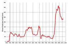 Russian explorers discovered placer gold in the Kenai River in 1848, but no gold was produced. Gold mining started in 1870 from placers southeast of Juneau.[7] Alaska produced a total of 40,300,000 troy ounces (1,250,000 kg) of gold from 1880 through the end of 2007. In 2015 Alaskan mines produced 873,984 troy ounces (27,183.9 kg) of gold, 12.7% of US production.[8] The largest gold producer is the Fort Knox mine, a large open pit and cyanide leaching operation in the Fairbanks mining district, which in 2019 produced 200,263 gold equivalent ounces.[9] The Pogo (159,344 ounces) and Kensington (127,914 ounces)[10] gold mines and the Greens Creek polymetallic mine (56,625 ounces) accounted for the remainder of 2019 gold production.[11]