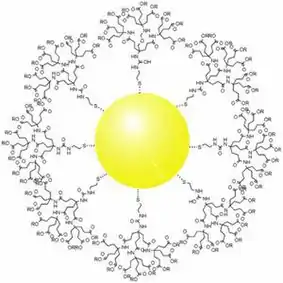 Gold nanoparticles have their advantages in drug vectorization. They can pack several different sizes and types of dendrimers and several different types of ligands in order to effectively treat different types of cancers. For example, research shows that 80~90% of breast cancer’s tumor cells have estrogen receptors[21] and 60~70% of prostate cancer’s tumor cells have androgen receptors.[22] These significant amount of hormone receptors play a role in intermolecular actions. This role is now used by targeting and therapeutic ligands on gold nanoparticles to target tissue-selective anti-tumor drug delivery. In order to have multiple targeting and therapeutic ligands bind with gold nanoparticles, the gold nanoparticles must first undergo polymer stabilization. Then, anti-estrogen molecules with thiolated PEG are bound to gold nanoparticles via Au-S bonds, forming thiolate protected gold nanoparticles.[23]