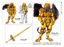 Goldar's design was initially identical to the original character design for his Zyuranger counterpart Grifforzar, which is visually similar to a manticore: a humanoid face, the body of a lion, and the tail of a scorpion. From the first episode, "Day of the Dumpster", to "Lions and Blizzards", the Goldar costume looked like Grifforzar, where the snout would move awkwardly whenever the character is talking.[1] Goldar's costume was revised in the show's second season, with more realistic skin, long fangs, and a mouth that could fully move, though the old iteration of Goldar with the rising snout would occasionally appear in recycled footage.[1]
