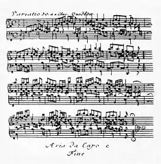 At the end of the thirty variations, Bach writes Aria da Capo e fine, meaning that the performer is to return to the beginning ("da capo") and play the aria again before concluding.