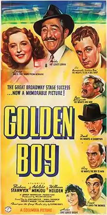 Golden Boy is a 1939 American drama romance sports film directed by Rouben Mamoulian and starring Barbara Stanwyck, Adolphe Menjou and William Holden. It is based on the 1937 play of the same title by Clifford Odets.