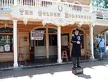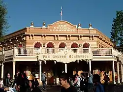 The Golden Horseshoe Saloon (referred to as Pecos Bill's Golden Horseshoe Saloon during construction) is a restaurant and attraction at Disneyland Park in Anaheim, California in the United States. It opened in 1955 with several other original attractions at Disneyland Park. Over the years the venue has housed multiple stage shows; it currently shows "Showdown at the Golden Horseshoe!" seven days a week. The "saloon" is located in Frontierland and has a picturesque view of the Rivers of America, New Orleans Square and part of Critter Country.