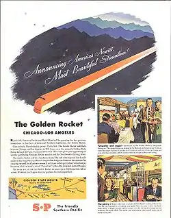 The Golden State's cars and locomotives retained the Golden Rocket colors well into 1953, after which time the locomotives were repainted in the SP's well-known red-and-orange Daylight livery. Both railroads advertised the Golden Rocket. It was promoted as "America's Newest, Most Beautiful Streamliner"; instead, it became "the train that never was."