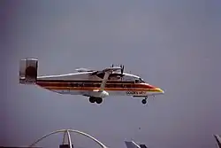 By the early 1980s, Golden West was the largest commuter airline in California operating a high frequency shuttle schedule between LAX and Santa Barbara and San Diego. In 1981, Golden West was the only air carrier flying nonstop between Santa Barbara and LAX with up to fourteen round trip flights a day.[5] Its fleet had grown to include larger aircraft such as the Short 330 and de Havilland Canada DHC-7 Dash 7. The 50-passenger seat Dash 7 was the largest aircraft ever operated by the airline. A huge debt service, among other factors, drove Golden West Airlines out of business in April 1983.[6]