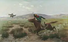 Golden eagles can be trained to be highly effective falconry birds, though their size, strength, and aggressiveness require careful handling to control the risk of injury to the falconer.[1] They have been used in this practice at least since the Middle Ages. In Asia, they were reportedly used in teams to hunt such animals as deer, antelope and wolves. Concurrently in Europe, their use for falconry was typically reserved for Emperors and Kings, which is why the common names for the golden eagle in various European languages roughly translate as the “royal eagle”.[2] In the United States falconers seldom use golden eagles, as the similarly aggressive Ferruginous hawk is more available and provides a similar hunting experience with most of the same game species with lower risk of injury to the falconer.[3] The most common interaction of American falconers with golden eagles is in trying to avoid them in order to reduce golden eagle attacks on their trained birds.[4] The very athletic golden eagle is approximately as swift as the large falcons, is quite willing to attack smaller raptors when the opportunity is available, and is often capable of flying down a falcon or hawk. Experienced falconers will consequently not fly their birds if golden eagles are spotted, and usually prefer to fly later in the day when the golden eagles have typically already fed.