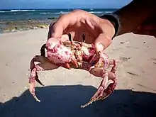 Like other ghost crabs, they are also strongly affected by human activity on their beach habitats, particularly by vehicles. In Western Australia, where driving off-road vehicles are common recreational activities by locals and tourists, ghost crabs are often crushed inside their burrows due to the weight of the passing vehicles. This is believed to contribute to their very low populations (up to 90% lower) in beaches near the urban areas in southern Australia.[25][26]
