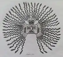 The rays of both suns are in pairs. They are an example of what archaeologist John H. Rowe called "Kennings". These are an artistic element of South American prehistory that consists of turning the long and thin appendages of any piece into snakes.[1]