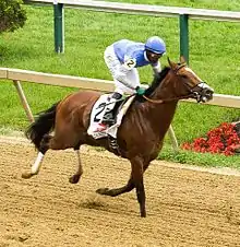Goldencents (foaled March 7, 2010) is an American Thoroughbred racehorse best known for winning consecutive runnings of the Breeders' Cup Dirt Mile. As a two-year-old he ran three times, winning the Delta Jackpot Stakes and finishing second in the Champagne Stakes (United States). In the following year he won the Sham Stakes and the Santa Anita Derby before finishing unplaced in the Kentucky Derby and the Preakness Stakes. He was brought back to sprint distances and ran well without winning before taking the Breeders' Cup Dirt Mile. As a four-year-old he won the Pat O'Brien Stakes and finished second three times before winning his second Breeders' Cup Dirt Mile.
