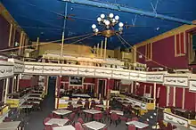 On 1 June 1962, a disastrous fire, caused by an electrical short, all but destroyed the superstructure of the auditorium, and caused severe damage to the entire structure. The Goldenrod was then purchased by a group of St. Louis businessmen headed by Frank C. Pierson and Don Franz, and restored to her original glory, and beyond. Plush carpeting was laid in the auditorium, with cabaret seating, under a huge crystal chandelier. Many antique appointments were salvaged from old St. Louis mansions being torn down. Brass fixtures and rails were restored or replaced, as was the tin ceiling and elaborate woodwork. A cocktail lounge was added, with a small bandstand where the St. Louis Ragtimers band played traditional ragtime for many years. The upstairs staterooms were converted into a buffet dining room. When this $300,000 renovation was completed, Goldenrod had her Grand Re-Opening in May, 1965. In 1967, she was registered as a National Historic Landmark. Mr. Pierson also owned the Becky Thatcher, a former packet boat, traveling no more but moored beside Goldenrod, featuring a restaurant, lounges, and gift shop.