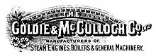 The Goldie & McCulloch Company Ltd. was a Canadian steam engine manufacturer based in Galt, Ontario. The company also manufactured woodworking machinery, industrial safes, French Burr millstones, boilers, turbine water wheels, bark mills and a variety of tannery machines. They primarily supplied the Canadian market, but the company had a strong export business to Mexico and South America.