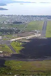 Initially built with a paved 3000 m runway and a large terminal and apron, the airport has not recovered from the 2002 eruption of the volcano Nyiragongo, 14 km to the north. The airport couldn't handle any wide-bodied aircraft except for freight operations run by relief agencies and the United Nations. A stream of fluid lava 200 m by 1000 m wide flowed onto the runway and through the city center as far as the lake shore, covering over the northern 1000 m of the runway and isolating the terminal and apron which were only connected by taxiway to the northern end. The lava can easily be seen in satellite photographs,[2] and aircraft can be seen using the 2000 m southern section of the runway which is clear of lava. A temporary apron was made at the side of the operational part of the runway. A Douglas DC-8 was left stranded on the terminal apron, which is now used by commercial passengers and the military. In December 2012, a contractor began work on cleaning up and fencing in the airport.[3] In February 2017, satellite imagery showed the runway has not yet been repaired where the lava damage occurred.[4]
