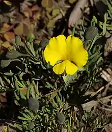 Gompholobium huegelii, commonly known as common wedge-pea[2] is a species of flowering plant in the family Fabaceae and is endemic to south-eastern Australia. It is an erect or spreading shrub with trifoliate leaves and cream-coloured to yellow and greenish, pea-like flowers.