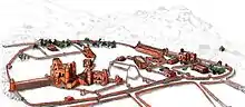 One of the most iconic works of Gondarine architecture was a royal complex known as Fasil Ghebbi and 44 churches that were built around Lake Tana including Adababay Iyasus, Adababay Tekle Haymanot, Atatami Mikael, Gemjabet Mariyam, Fit Mikael and Qeddus Abbo.[10] Fasilides was also credited with building seven stone bridges including the Sebrara Dildiy bridge over the Blue Nile. Fasilides contributed a new church at the Cathedral of Church of Our Lady Mary of Zion at Axum, named "Old Cathedral" which stands next to the newer cathedral built by Emperor Haile Selassie.[11] According to legend, the Ethiopian Orthodox Tewahedo Church would be constructed by the name of letter "G". As a result, the Emperor behind Fasilides often built stone castles in Gorgora, Gomange, Guzara and Gannata Iyasus. After becoming aware of the fact, the scenario of urban life in Ethiopia was conceptualized by building more royal camps with replacement of semi-itinerants royal tents to stone and mortar.[12]