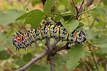 A sure sign of the presence of mopane worms is defoliation of mopane woodland - sometimes around ninety per cent of leaves.[1][12] Fenced-in browsing animals may rely on the mopane, and on other trees favoured by the caterpillars, as an important part of their diet. Some farmers therefore view the mopane worm as competition for their livestock, and attempt to eradicate the "pest" with insecticides and the like. However, the caterpillar season is short, and the trees sprout the new, tender foliage which browsers prefer, so this problem can be managed in other ways, for example, by working to mutual benefit with the local caterpillar harvesters who will control the worms by harvesting them.[5]