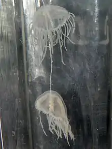 The gonads are four yellowish structures embedded in the surface of the epidermis beneath the radial canals. The ovaries are more granular in appearance than the testes (sexes are separate). The gametes are shed into the sea, and the zygotes develop into ciliated planular larvae which grow into minute polyps. These polyps can bud off other polyps or medusae. The tentacles of the medusae are hollow and connected to the exumbrellar surface by a tentacular bulb where cnidoblasts are formed.