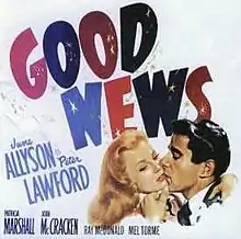 Good News is a 1947 Metro-Goldwyn-Mayer musical film based on the 1927 stage production of the same name. It starred June Allyson, Peter Lawford, Mel Tormé, and Joan McCracken. The screenplay by Betty Comden and Adolph Green was directed by Charles Walters in Technicolor.