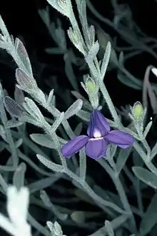 Goodenia incana is an ascending herb that typically grows to a height of 30 cm (12 in) and is covered with silvery-white hairs. The leaves are linear to lance-shaped with the narrower end towards the base, mostly arranged at the base of the plant, 20–40 mm (0.79–1.57 in) long and 3–8 mm (0.12–0.31 in) wide. The flowers are arranged in racemes up to 200 mm (7.9 in) long, with linear bracteoles 6–12 mm (0.24–0.47 in) long. Each flower is on a pedicel 2–5 mm (0.079–0.197 in) long with lance-shaped sepals 4–7 mm (0.16–0.28 in) long. The petals are blue, 12–15 mm (0.47–0.59 in) long, the lower lobes of the corolla 6–7 mm (0.24–0.28 in) long with wings about 2 mm (0.079 in) wide. Flowering mainly occurs from September to January and the fruit is an oval capsule 8–9 mm (0.31–0.35 in) long.[2][3]