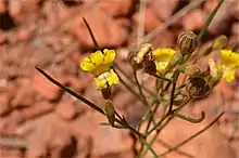 Goodenia triodiophila, commonly known as spinifex goodenia in the Northern Territory,[2] is a species of flowering plant in the family Goodeniaceae and is endemic to arid inland areas of Central Australia. It is a stiff, wiry, much-branched, ascending perennial herb with needle-shaped or linear leaves on the stems and racemes of yellow flowers with a brownish centre.
