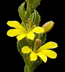 Goodenia viscida, commonly referred to as viscid goodenia,[2] is a species of flowering plant in the family Goodeniaceae and is endemic to the south-west of Western Australia. It is an erect perennial herb or shrub with narrow oblong to egg-shaped leaves with toothed edges, and spikes of yellow flowers.