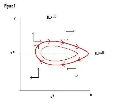 Since the model cannot be solved explicitly, it is instructive to analyze the trajectory of the economy in terms of a phase diagram. The two lines defining the center of the cycle divide the positive orthant into four regions. The figure below indicates with arrows the movement of the economy in each region. For example, the north-western region (high employment, low labor's share in output) the economy is moving north-east (employment is rising, worker's share is increasing). Once it crosses the u* line it will begin moving south-west.