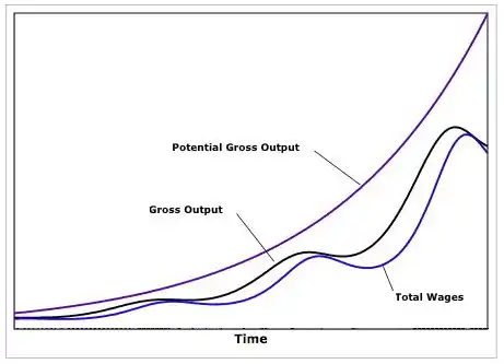 The figure below illustrates the movement of potential output (output at full employment), actual output and wages over time.