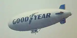The Goodyear Blimp is any one of a fleet of airships (or dirigibles) operated by the Goodyear Tire and Rubber Company, used mainly for advertising purposes and capturing aerial views of live sporting events for television.[3] The term blimp itself is defined as a non-rigid airship—without any internal structure, the pressure of lifting gas within the airship envelope maintains the vessel's shape.