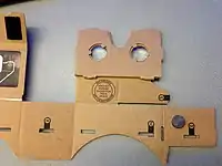 Google Cardboard is a discontinued virtual reality (VR) platform developed by Google. Named for its fold-out cardboard viewer into which a smartphone is inserted, the platform was intended as a low-cost system to encourage interest and development in VR applications.[1][2] Users can either build their own viewer from simple, low-cost components using specifications published by Google, or purchase a pre-manufactured one. To use the platform, users run Cardboard-compatible mobile apps on their phone, place it into the back of the viewer, and view content through the lenses.