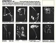 The original product line included abstract moving table-top sculptures. Powered by the electric motors in the bases, fabricated wire kites and figures moved, swayed and bounced (Bradt, 1975). The sculptures were sold directly to retail gift shops and jewelry stores. As Collette sold the products and took care of the business, Bradt made the sculptures in his workshop in Wilmette.[8] Bradt continued to develop new sculptures, and a line of animated, motorized sports figures emerged from the process.[11]