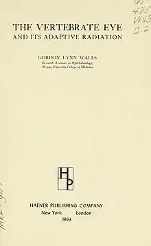 In 1958 Walls wrote a chapter in The eye in evolution, the first volume (780 pages) of Stewart Duke-Elder's work System of Ophthalmology, a monumental multivolume contribution to medical literature.[3] In all, he published more than sixty journal papers and monographs, one book, and chapters to three other books.[4]