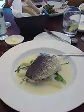 Pricing is similar to other restaurants owned by Ramsay, and it is intended to bring a fine dining experience out of specialist airport lounges and make it available to any traveller. Starters include a pea, leek, and goat cheese tart, while mains include sea bass which is steamed and served alongside lemongrass and white asparagus. Chocolate fondue with marshmallows and waffles are among the options for dessert as well as a knickerbocker glory.[8][10] Traditional fine dining dishes are also included on the menu, such as Sevruga caviar.[2] Ramsay said in interviews around the launch of the restaurant that he aimed to keep "it all very lean, lean, lean. No heavy sauces".[5] He compared the menu to a cross between The Ivy, his own Boxwood Cafe and The Wolseley.[5] A specific menu is offered for quick dining, called "Plane Fast". This has multiple-course meals which aim to be served within 25 minutes.[7]