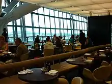 The interior is decorated with a marble bar,[2] above which hangs a painting by Barnaby Gorton worth £90,000.[5] There are large windows at one end of the restaurant, which look out onto the airport itself.[2] The restaurant has a seating capacity for 175 diners.[5]