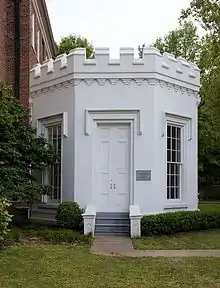 This small octagonal building with crenelations originally served as the guard house of the university. It was completed in 1860 and reflected the conversion of the university into a military campus. The conversion occurred on February 23, 1860, by an act of the Alabama legislature. As tensions between North and South escalated, the request for the transition came from the university president of the time, Landon Garland.[3] Ironically, the Little Round House, despite its military associations, was one of the few structures that remained after Federal troops burned the campus. When the university reopened its doors in 1871 the building was used as a physician's office. A few years later, while in a deteriorated condition, the building was considered for demolition. It was saved by the university trustees and converted into a records repository. It became known as Jasons Shrine during the 1930s, while being used by the Jasons, a men's honor society. 1990 saw the structure converted into a memorial for all of the honor societies.[8][9]