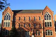 Built in 1884, the Gothic Revival-style Clark Hall was constructed on the site of the old Lyceum, destroyed during the Civil War. Clark was originally designed as an all-purpose building with a library, reading rooms, chapel, and a large public meeting room,[8][9] which served as "the great public hall of the University."[10] By 1910 the building was beginning to deteriorate and the brick walls were near collapse by the late 1940s, due to the heavy roof. The hall was saved by the erection of an interior steel frame within the building, preserving it for future generations. The building was restored again in the 1980s. It was named for Willis G. Clark, a university trustee.[8][9]
