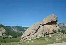Gorkhi-Terelj National Park (Mongolian: Горхи-Тэрэлж [ɡɔrxi tɛrɛɮʃ], creek-rhododendron) is one of the national parks of Mongolia. The Terelj tourist zone has a number of "tourist camps" (Mongolian: жуулчны бааз, juulchny baaz). It is connected with Ulaanbaatar by a paved road (main road to the East #A0501 Baganuur-Öndörkhaan direction, 37 km from Ulaanbaatar city center, left turn to the branch #A24, 5 km later road crosses Tuul River and the National park territory begins). The road comes to the Gorkhiin Davaa (Mongolian: Горхийн даваа) pass. Most of the tourist camps and tourist attractions are before this pass. The road then ends at the settlement of Terelj, which features small shops and restaurants. The Terelj settlement is located in the valley of the Terelj River (Terelj Gol), approximately 66 km from the Ulaanbaatar city center. The national park tourist zone is formally in Nalaikh düüreg (district) part of Ulaanbaatar municipality, the rest of the protected zone beginning to the north of the Terelj River, is located in Mongolia's Töv Province (Töv aimag).[1]
