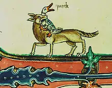 One famous image from the Psalter shows a fox carries a goose away in its mouth, while the goose says queck. The scene is probably an allusion to the tale of Reynard the Fox.[1] Armorial illustrations showing in the manuscript have been identified as those of Roger Bigod, (f. 70b), Gilbert Peche, (f. 86), and Aymer de Valence, (f. 107v).[2]